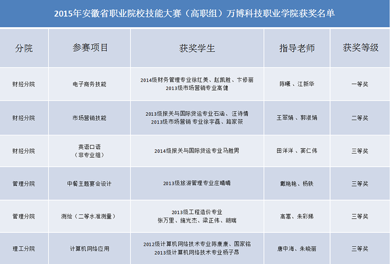 日前,2015年安徽省职业院校技能大赛(高职组)比赛结果正式公布,我院在此次大赛中获得重大突破,由我院财务管理专业和市场营销专业4名同学组成的电子商务参赛团队在电子商务技能项目上勇夺一等奖❕,其次我院在财经大类🛀、电子信息大类🥭、旅游大类等比赛项目中也收获颇丰🪵,获得二等奖1项🦹🏿♀️9️⃣,三等奖4项的好成绩。