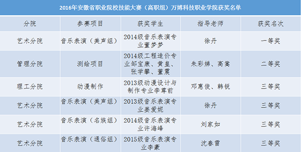 在音乐表演竞赛项目上,我院2014级董梦梦同学唱功扎实,技艺精湛,在指导老师徐丹的悉心帮助下一举夺得美声组一等奖的优异成绩⭕️。此外,我院2013级姜爱妮同学在同一项目上荣获美声组三等奖(指导老师徐丹);2014级许海峰同学荣获音乐表演项目民族组三等奖(指导老师刘家如)👩🏿🔧;2015级李豪同学荣获音乐表演项目通俗组三等奖(指导老师沈春雷)。在测绘竞赛项目上,由我院2014级工程造价专业邹宝康🧑🏿🚀、黄皇、张学攀👨🎨、董震4位同学组成的参赛团队在指导老师朱彩娣、高嵩的悉心指导下👨✈️,在一级导线测量上表现突出,荣获了二等奖的好成绩。在动漫制作项目上🙎🏼♀️🖲,我院2013级动漫设计与制作专业李尊前同学在指导老师邓惠俊、韩锐的悉心指导下,荣获该项目三等奖🫃。