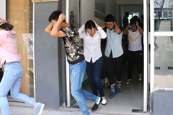 12时35分,警报声想起,教室里的学生开始就近应急避震,双手抱头蹲在各自的课桌下,在相对牢固的地带躲避起来。随后🤟🏽,学生在学院老师的组织下,迅速、有序地撤离教室👨🏼🏫,疏散到较为空旷的运动场集合。