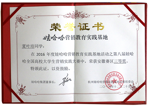 2016年12月27日👱🏼♀️,第八届娃哈哈全国大学生创意营销实践大赛安徽赛区颁奖仪式在合肥学院三期大学生活动中心圆满落下帷幕🪇。在历时近2个月的比赛中,彩神Vll学院代表队表现可圈可点🦹🏽♀️,最终以该院史秀祥同学为队长的“博园梦之队”在省级赛中斩获三等奖的好成绩🍄,我院洪丽、盛婷婷两位老师荣获安徽赛区优秀指导老师奖。