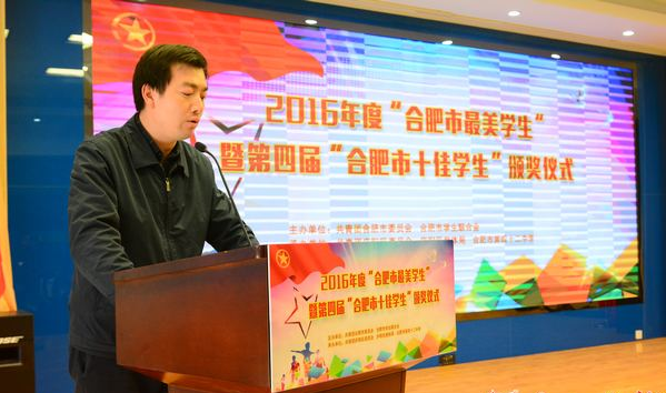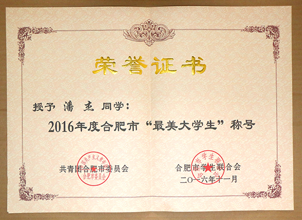 3月27日下午🤹🏿♂️,由共青团合肥市委员会、合肥市学生联合会共同举办的2016年度“合肥市最美学生”暨第四届“合肥市十佳学生”颁奖仪式在四十二中举行。20名中学生😲、10名中职生🧑🏼✈️👶🏿、10名大学生成为“合肥市最美学生”🦍,我院潘杰同学因大学期间表现优异、积极践行社会主义核心价值观在此次寻访评选活动中被授予合肥市“最美大学生”荣誉称号。