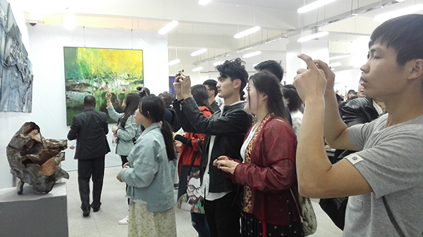 展览现场,高达935件的参展作品聚焦当今艺术前沿🈵,类型独具特色。唯美的传统绘画👩✈️🗯、当代的架上艺术、实验艺术与行为艺术的融合、古典音乐与装置艺术的嫁接🏌🏿🛣、全息影像时空雕刻更加彰显艺术的时尚风貌🔥。整个展览既有安徽艺术大师精心准备的艺术饕餮大餐🚤,也有90后学生们的清新小品⚫️;可谓高潮迭起、异彩纷呈。形式多样的艺术作品让同学们赞叹不已🥝、有的近距离观看画面细节🎳🤾🏻♂️、有的三五成群交流心得👨🦽➡️、有的纷纷拍照留作资料🔅。