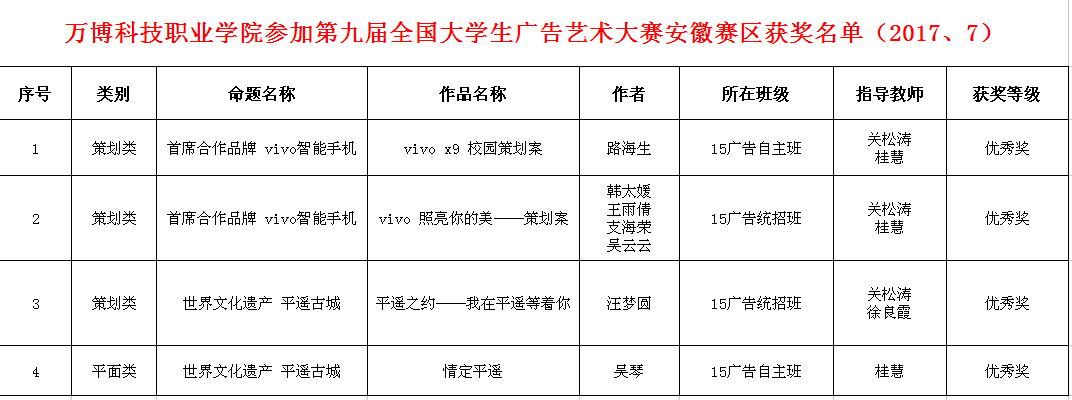 2017年7月21日,从第九届全国大学生广告艺术设计大赛(简称“大广赛”)组委会安徽分赛区传来喜讯🗒,我院的广告设计与制作专业的学生在其教研室主任关松涛、专职教师徐良霞和桂慧等老师的指导下,共获得了4项优秀奖,其中关松涛、桂慧老师指导的15广告自主班的路海生同学、15广告统招班的韩太媛、王雨倩等同学,关松涛、徐良霞老师指导的15广告统招班汪梦圆同学分别所撰写的广告营销策划案均获得大赛的策划类优秀奖⛽️;桂慧老师作指导的15广告自主班吴琴同学创作的平面作品(广告语)获得大赛的平面类优秀奖🏊🏿♀️🥝;这是我院师生近10年第一次参与此项比赛🤳🏿,也是零的突破🚡,更是新的起点。