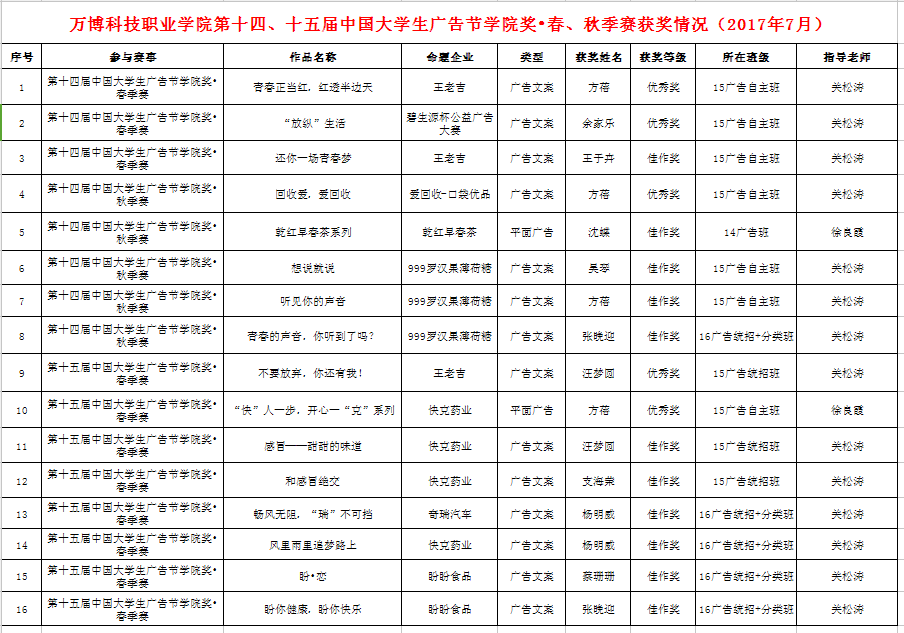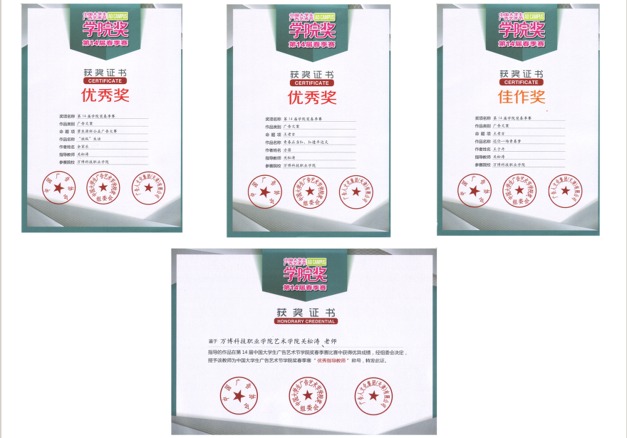 我院广告设计与制作专业的师生从2016年的第14届中国大学生广告艺术节学院奖春季赛开始参赛,截止到目前的第15届中国大学生广告艺术节学院奖春季赛,共参加学院奖3个赛季的赛事,在大赛之中共取得优秀奖5项💁🏻,佳作奖11项,优秀指导教师5人次🦶🏻,据悉👨🏻⚕️,这样的成绩在全省的高职院校之中成绩也是可喜的。