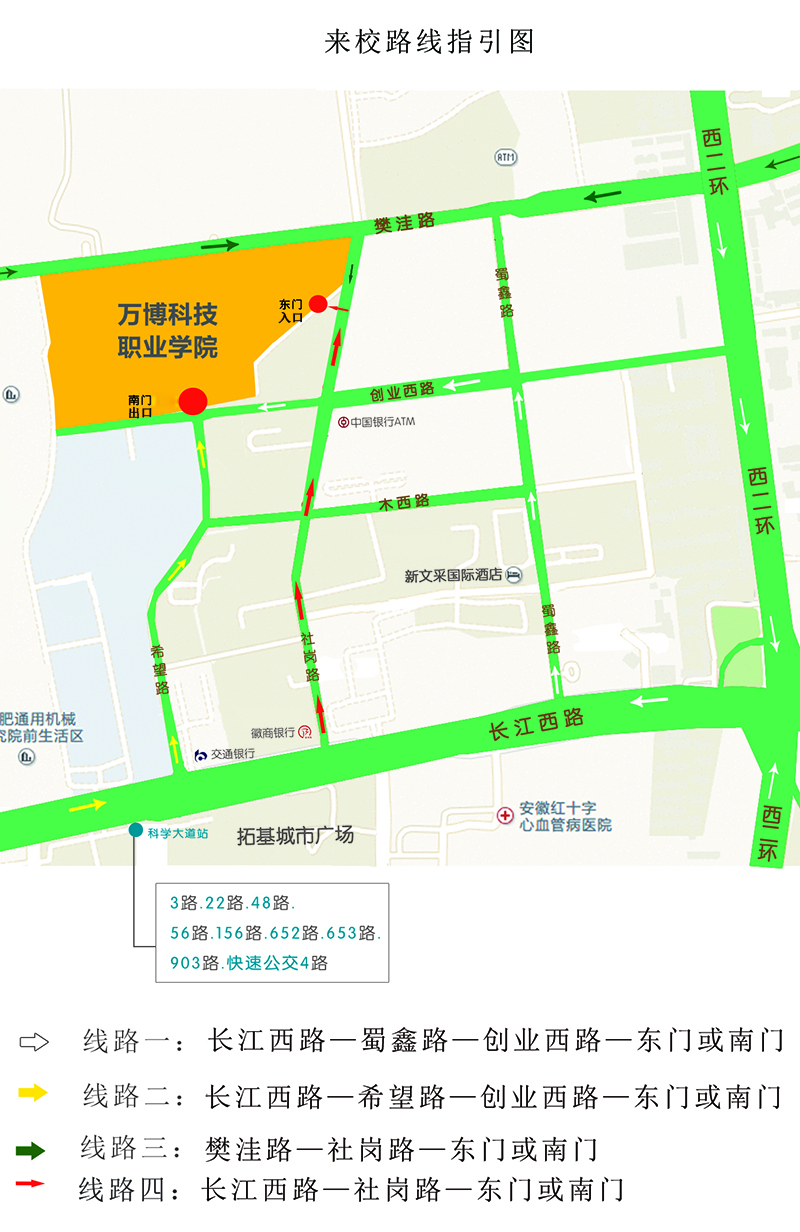 自行来校报到的同学,从合肥火车站乘22路车至“科学大道”站下👩🚀,往西约50米进入社岗路,沿社岗路往北走到我院东大门。从南站乘108路车到“卫楼”站下,沿樊洼路往西约30米左转进入社岗路📬,沿社岗路往南即可走到我院东大门。开车送孩子来校报到的家长需注意🦸🏻♂️,报到当天因车流量大,所有车辆都要按照工作人员的引导从东门进,南门出。