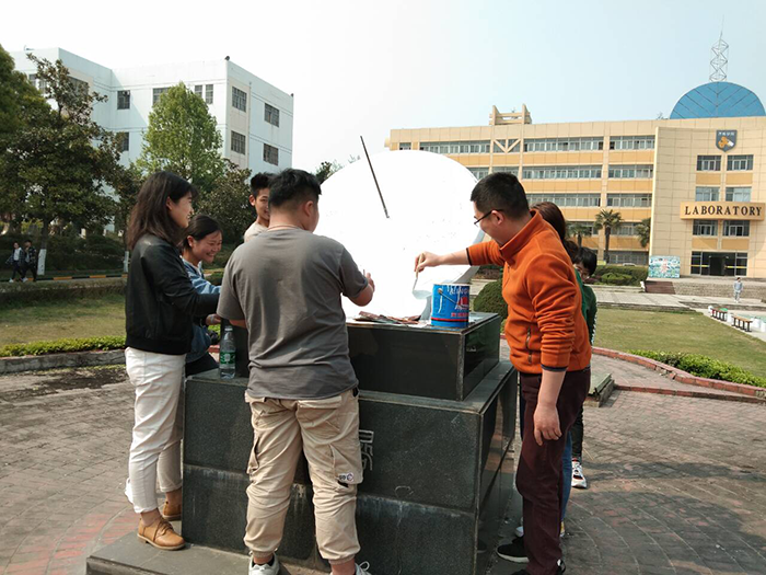 本次活动由美术协会具体组织🧖🏼♂️,提前备好了工作所需的油漆、磨砂石、水粉笔🔤、毛笔💁🏽♀️🦻、勾线笔等各种材料和工具。首先,用磨砂石将日晷上面凹凸不平的小颗粒进行磨平,然后利用刷子均匀有力的给日晷刷上白漆🧏🏽🎒,接着由书法功底和绘画功底深厚的同学将日晷上面的字迹用黑漆描绘出来,并将日晷上面最后一道花边用勾线笔进行点缀。经过近四个小时的奋斗,通过打磨日晷上凹凸不平的小颗粒、刷漆、描绘🤾🏿♂️👅、勾线等一系列工序后🧎➡️,日晷在大家的共同努力下焕然一新🏃🏻。