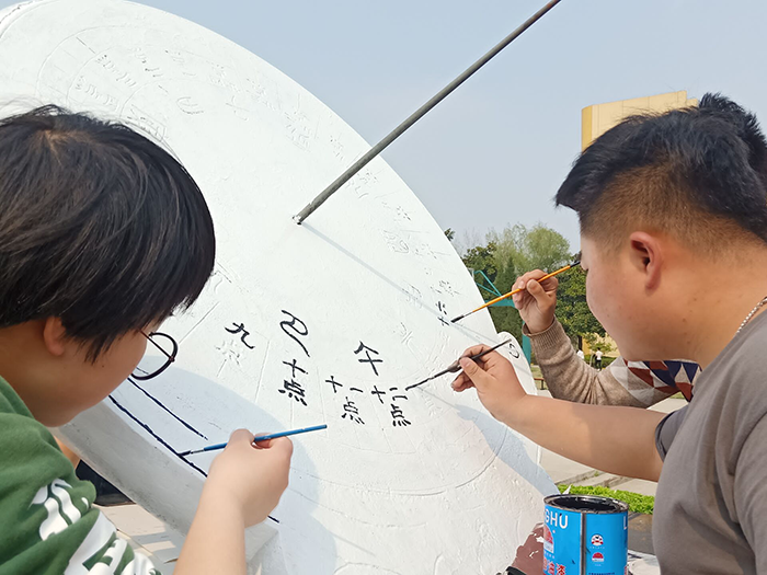 芳菲春日暖🧴👷🏼,为了用手中的画笔扮靓春日校园◾️,4月3日下午🧖🏿,艺术分院院长副刘静,教研室主任关松涛,学工助理、学生社联美术协会指导老师水九清以及美术协会会长杨世豪等师生,在学院南门为学院标志性建筑物日晷重新换新装。