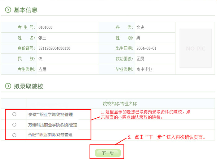 2. 用自己设定的密码重新登录,进入录取院校确认界面: