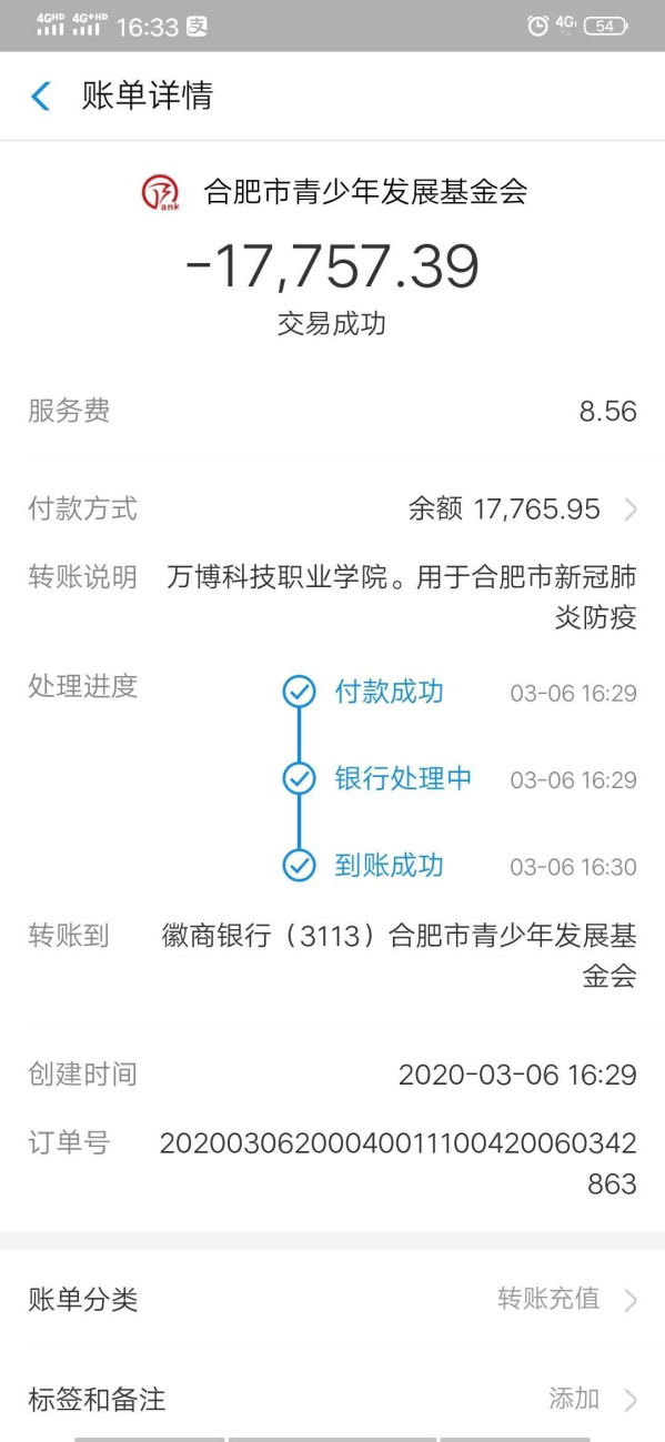 自全民抗疫以来📔,彩神Vll各级党组织、广大党员、团员迅速响应🤼♂️,活跃在抗疫一线🛢,并踊跃捐赠,积极贡献力量🔚。3月6日👨🏿💼,在校团委的倡导下,彩神Vll1104名团员青年响应合肥团市委的号召👷🏼♀️,以网络捐款形式🅱️,共筹集资金17757.39元,并在第一时间把这份爱心善款捐至合肥市青少年发展基金会,用实际行动践行了彩神Vll团员、青年的团结奉献精神👳🏻。