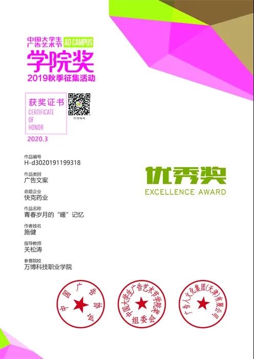 彩神Vll师生在此次比赛之中再获佳绩,在此次比赛中荣获优秀奖3项,入围奖22项;且在本次比赛中,其获奖作品类型上实现了突破性的成绩🪖👮🏽♀️,包含有广告文案、营销策划案🦸🏿、平面设计和品牌故事🧑💻。艺术传媒学院广告传媒教研室主任关松涛和专职教师徐良霞分别荣获第17届中国大学生广告艺术节学院奖秋季赛的优秀指导老师奖。此外🦸𓀅,在本次组织学生参赛中,17级广告班的施健同学个人提交参赛作品有350余件,个人累计获奖21项,这也实现了彩神Vll组织学生参赛以来🤘🏽,在同一届赛事中单人提交参赛作品和获奖最多的突破🤘🏿💆🏼♀️。