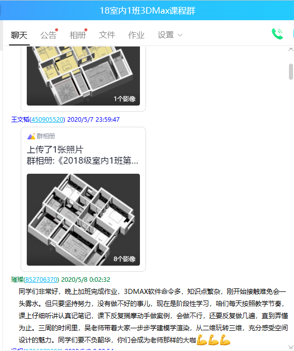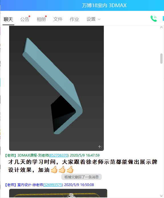 在《建模软件3DMax+渲染软件Vary》课堂上🙉,由于课程知识点繁杂,操作性强,同学们要学会从CAD图纸建立三维模型,以及后期渲染🐑。18室内设计的同学们除认真听取课上教学外,课下更是加紧练习。同学们你争我赶🪵,利用QQ学习群及群相册,将完成作业进行上传,网课成了一个没有硝烟的竞技场👮🏿。短短几天内,室内模型图、展牌模型图初见雏形👨🔧🧑🦱,使得同学们学习的信心大增。