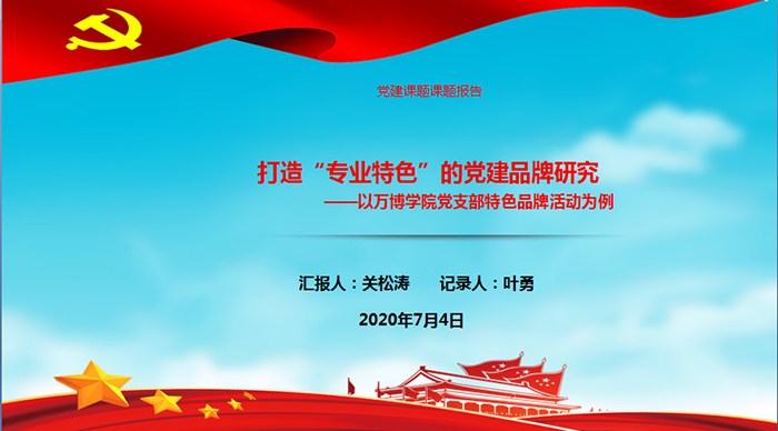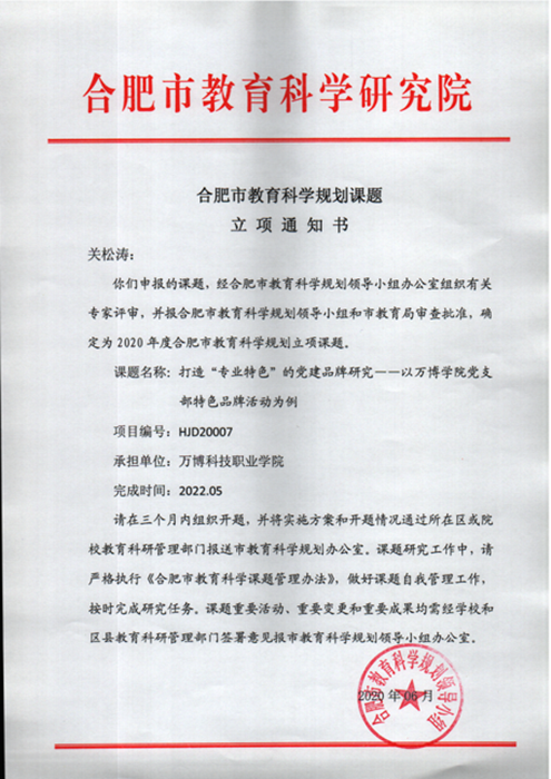 2020年7月4日🧑🏿🦳,由彩神Vll教学第四党支部书记关松涛副教授,牵头申报的党建课题《打造“专业特色”的党建品牌研究——以万博学院党支部特色品牌活动为例》( 项目编号HJD20007)参加了2020年度合肥市教育科学规划立项课题开题论证会🚵🏿♀️。