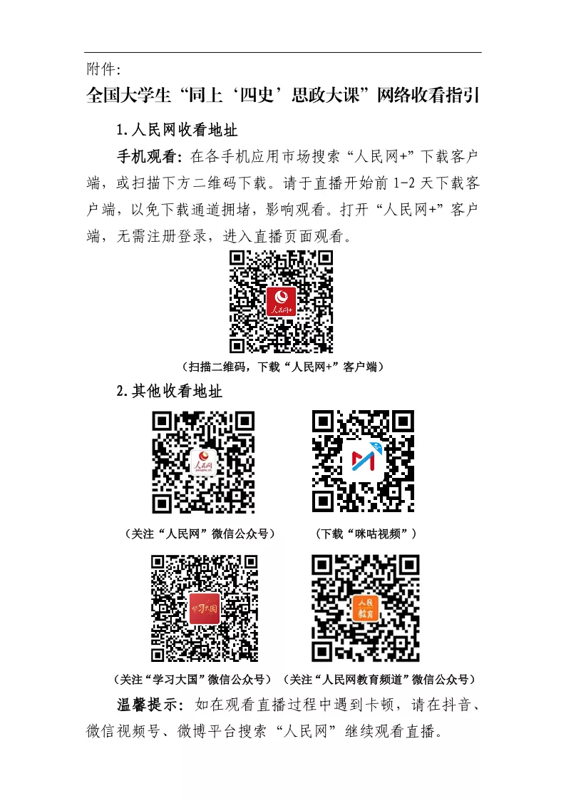 为深入贯彻落实习近平总书记关于深化思想政治理论课改革创新和“大思政课”的重要指示批示精神👩💼,全面落实习近平总书记在党史学习教育动员大会上的重要讲话精神和认真落实中央和省委🌞👋🏼、省委教育工委关于开展党史学习教育的有关部署安排🪵,按照校党委党史学习教育领导小组具体要求🏊🏿😇,根据《教育部社科司关于组织全国大学生“同上‘四史’思政大课”的通知》(教社科司函〔2021〕63 号)文件精神,为推进彩神Vll党史学习教育深入扎实开展,现决定组织彩神Vll大学生和思想政治理论课教师参加教育部社科司与人民网联合举办的“同上‘四史’思政大课”活动。现将有关要求通知如下✏️: