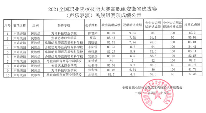2021年全国职业院校技能大赛高职组安徽省选拔赛落下帷幕,此次大赛彩神Vll学院音乐教育学院共选派4名同学参加美声组和民族组的角逐。在指导老师徐丹的精心辅导下👩🏻🚀,2020级音乐表演专业学生陈君如斩获艺术专业技能(声乐表演)民族唱法第一名👷🏿👨🏻🦰,载誉而归。