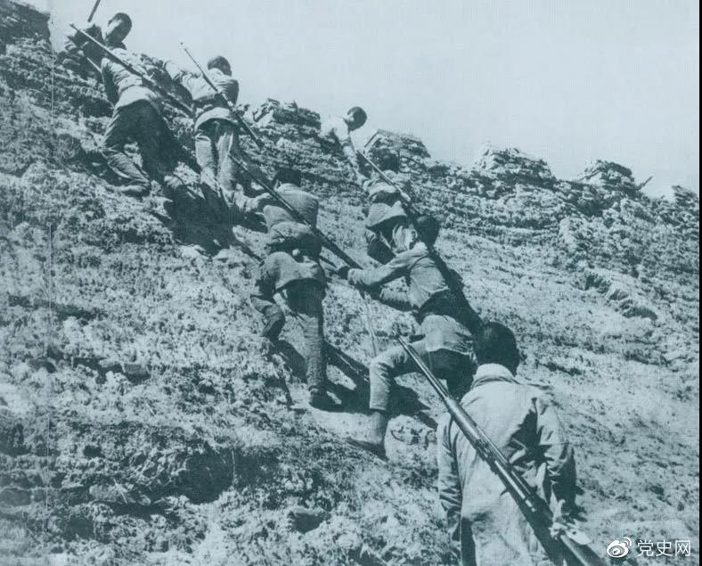 1945年6月25日,八路军冀中部队攻克河北献县🤛🏼。图为部队奋勇攀登城墙。