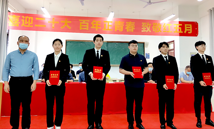 (党委委员沈春雷为校级“优秀团员”、“优秀团干”颁发荣誉证书)