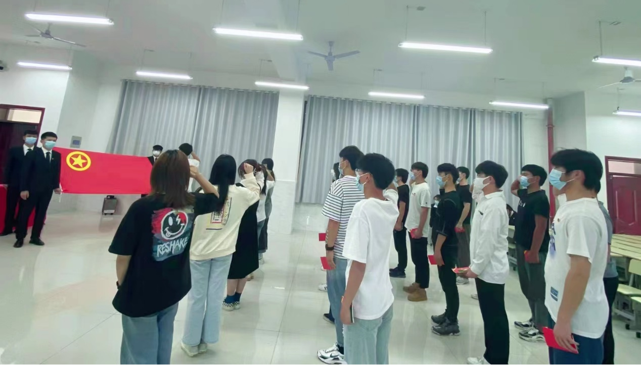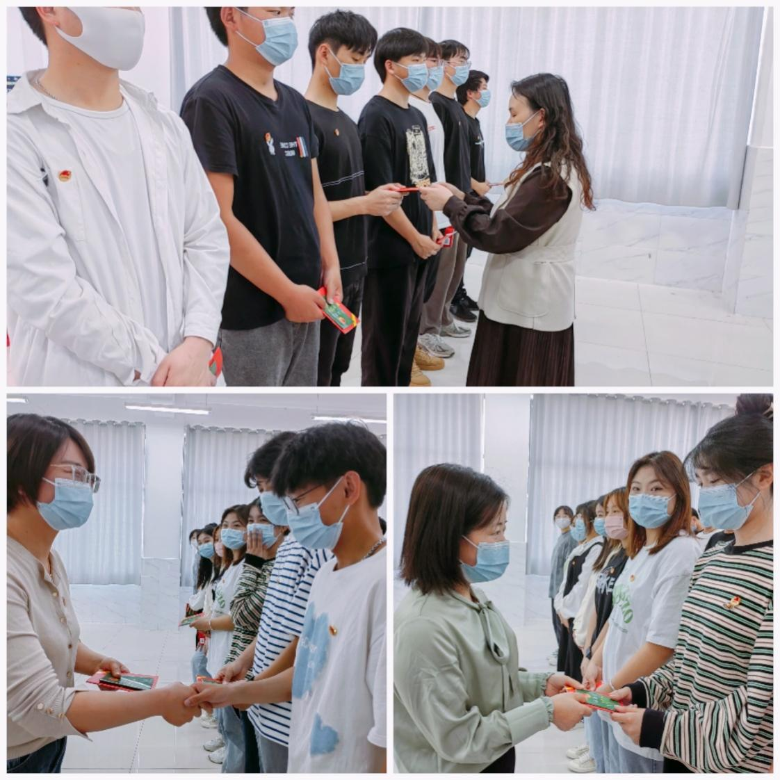 伴着雄壮的国歌声,入团仪式正式开始🐊,主持人阐述了举办此次入团仪式的意义⛩,三位书记为所有新团员门颁发团员证和团章,并逐一佩戴团徽。在校团委老师许鑫宇的带领下,佩戴整齐的新团员们在团旗前庄严宣誓。