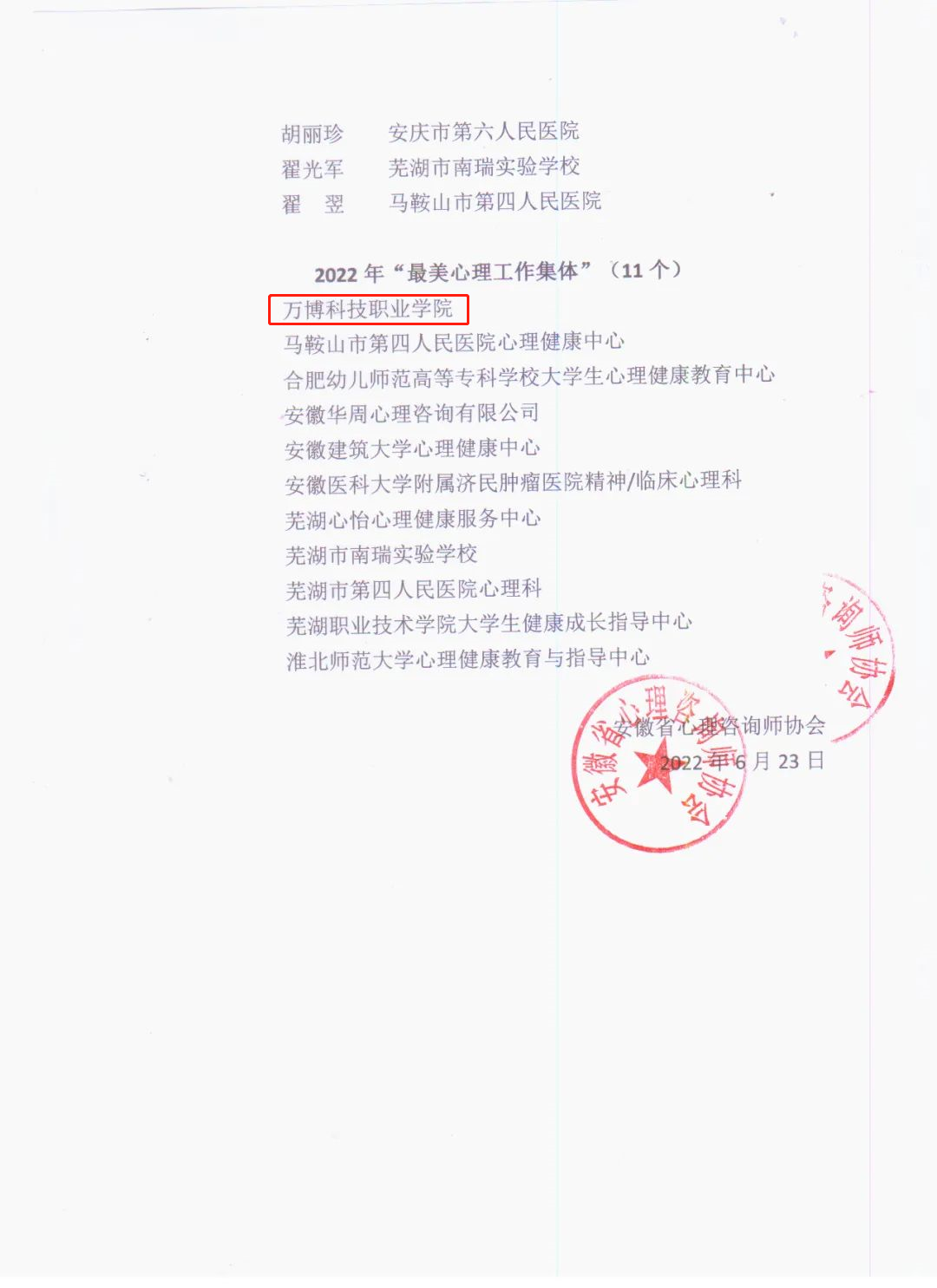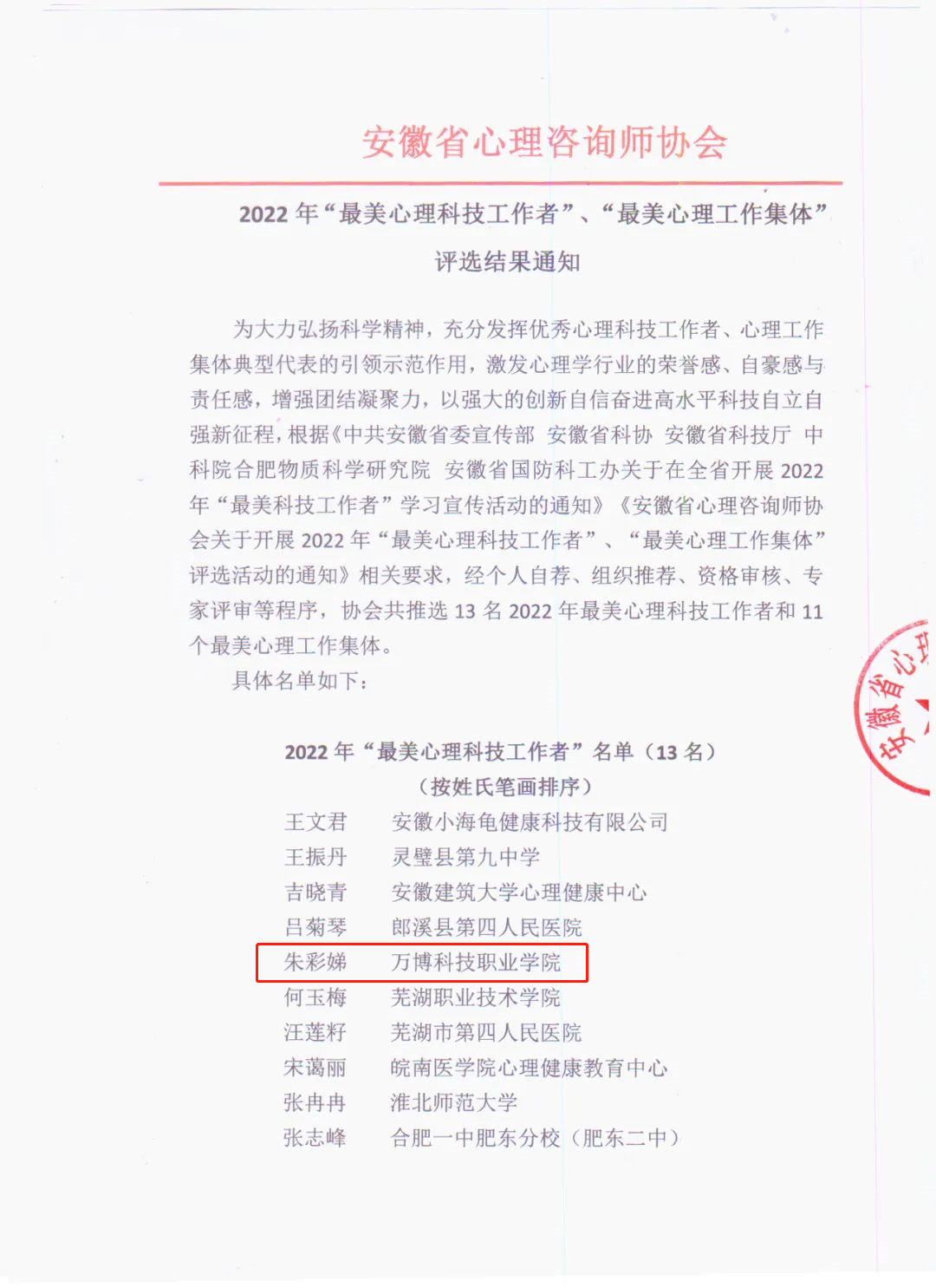 6月24日,经过层层选拔,彩神Vll最终荣获2022年安徽省“最美心理工作集体”🧑🚒,朱彩娣老师荣获2022年安徽省“最美心理科技工作者”。