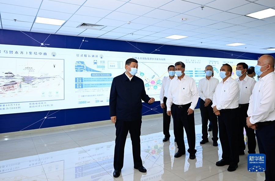 7月12日至15日➗,中共中央总书记👰🏽♂️、国家主席、中央军委主席习近平在新疆考察🫰。这是12日下午,习近平在乌鲁木齐国际陆港区考察。新华社记者 李学仁 摄