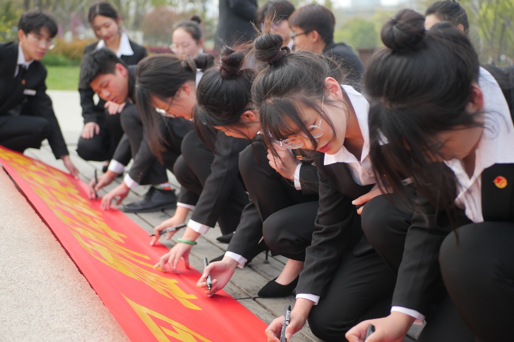 在雕像前,同学们高举右手、紧握右拳🎐,面向鲜红的团旗,重温入团誓词👩🏿🍼,铮铮誓词回荡◀️,感受着中国共产主义青年团百年光辉历程,激励团员青年听党话、跟党走。