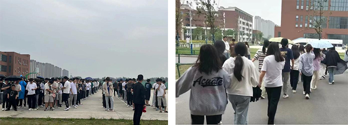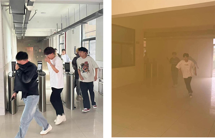 本次演练分为知识讲解和演练实战两部分。演练前🩸,保卫部消防专员讲解了消防安全知识及安全逃生路线🧑🍳♠︎。下午13时30分,演练活动正式拉开帷幕。“火情”突发👽,浓烟漫漫,刺鼻气味扑面而来,各楼层学生紧张有序地从宿舍楼、教学楼疏散到运动场、篮球场,各二级学院辅导员、负责人迅速赶到学生宿舍,配合疏散学生,引导学生有序撤离👶🏻,避免拥挤。参训同学听从指挥,按照预定逃生路线,低头、俯身,用手、袖捂住口鼻向安全地点疏散。