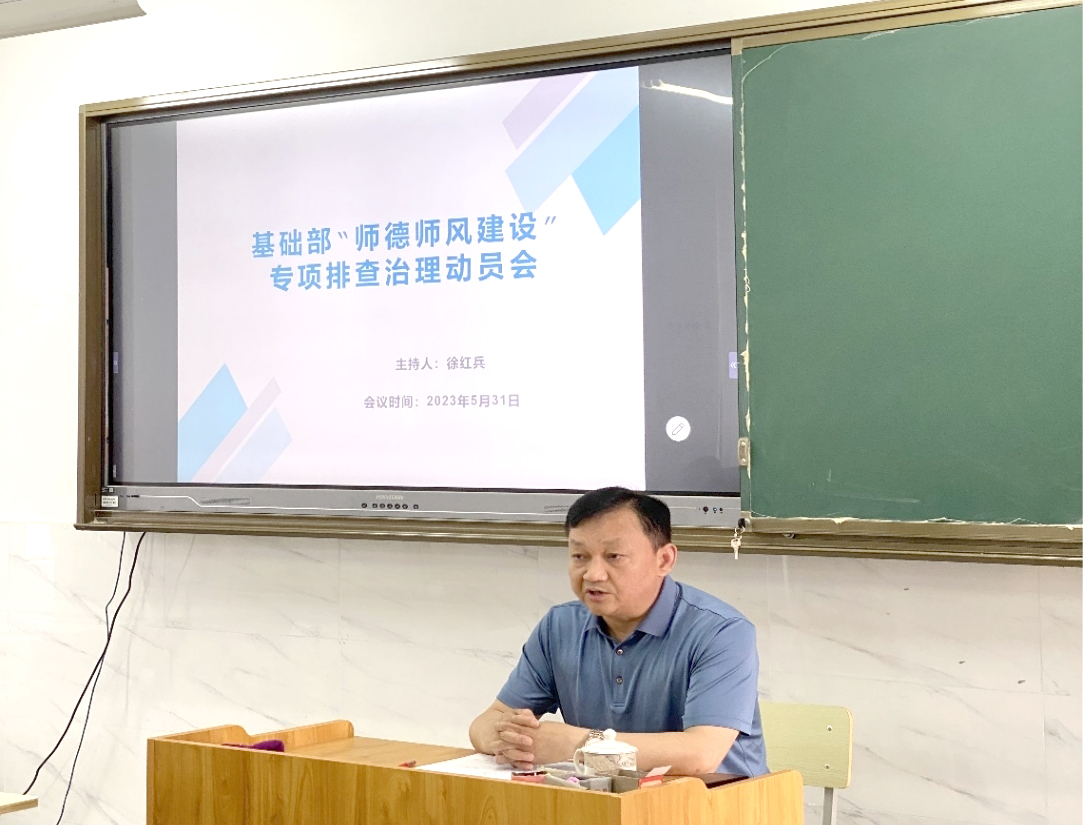 为深入贯彻落实进一步加强新时代教师队伍建设,进一步规范教师从教行为,努力建设一支“有理想信念、有道德情操、有扎实学识、有仁爱之心”的教师队伍👱🏻♀️,按照学校师德师风建设工作领导小组要求👨🏿🦲,基础部于5月31日下午在1505教室召开师德师风建设专项排查治理工作动员会🧛♂️。基础部全体教职人员参加会议,会议由基础部负责人徐红兵主持。