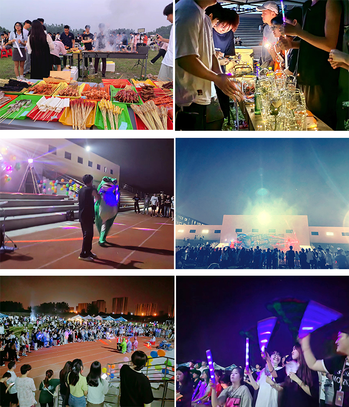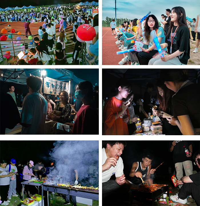 动人的音符、优美的舞姿,同学们跟随节奏挥动荧光棒、欢呼呐喊,现场无处不涌动着青春的活力气息,烧烤架火力全开👩🏼🦲,每个角落都氤氲着烟火的温度。同学们听着音乐的节拍,吃着美味的烧烤,逛着夜市跳蚤市场,在灯海簇拥与人声鼎沸中感受脉搏与音乐的同频、听觉与味觉碰撞的盛宴。活动现场气氛热烈,不绝于耳的掌声和呐喊声响彻整个校园,师生们一共享受着这独特校园美食节的喜悦📡。