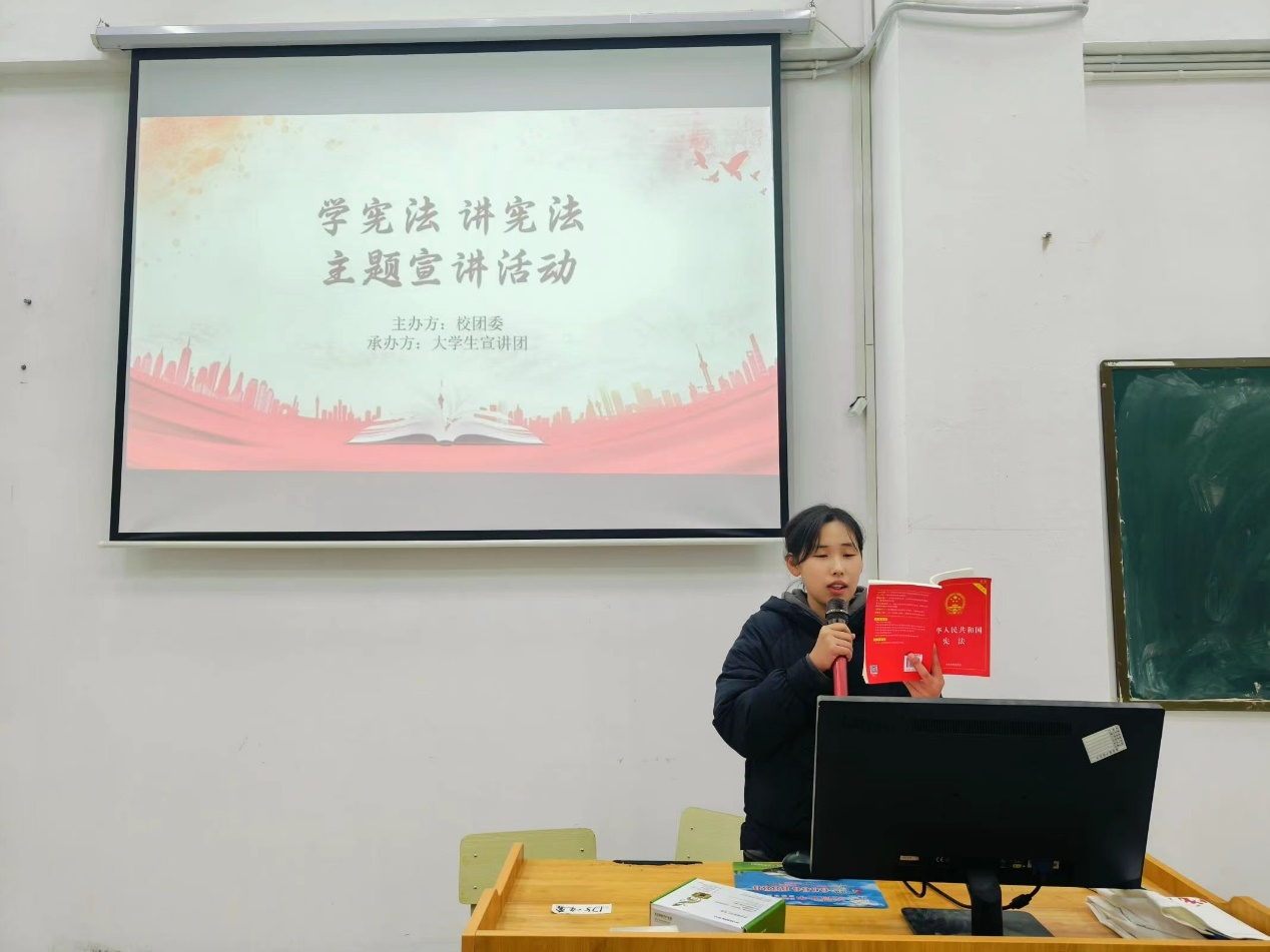 12月4日是国家第10个宪法日。当天早晨,校学生会组织开展“宪法晨读”活动,由学生会主席团成员领读宪法序言及正文中的部分章节🙅🟩、条款,全体同学齐声跟读,大家精神饱满,庄严肃穆🐕👱🏼♂️,声声入耳🛟,用心体会宪法的神圣与庄严💪🏿;大学生宣讲团利用晚自习时间在多媒体教室进行宪法宣讲会🪝,各二级学院学生会、各学生组织等180余名团学骨干参加🤹🏽♀️。宣讲人员围绕宪法赋予公民的权利和义务、我国宪法发展历程和主要内容🖕🏽,用大家听得懂、记得住🕵🏿♀️、乐意学的方式讲出来👮🏿♂️,同时与大家积极互动🚴🏼♀️,同学们踊跃发言👨🏽💻,分享学习心得🪑,现场氛围浓烈。