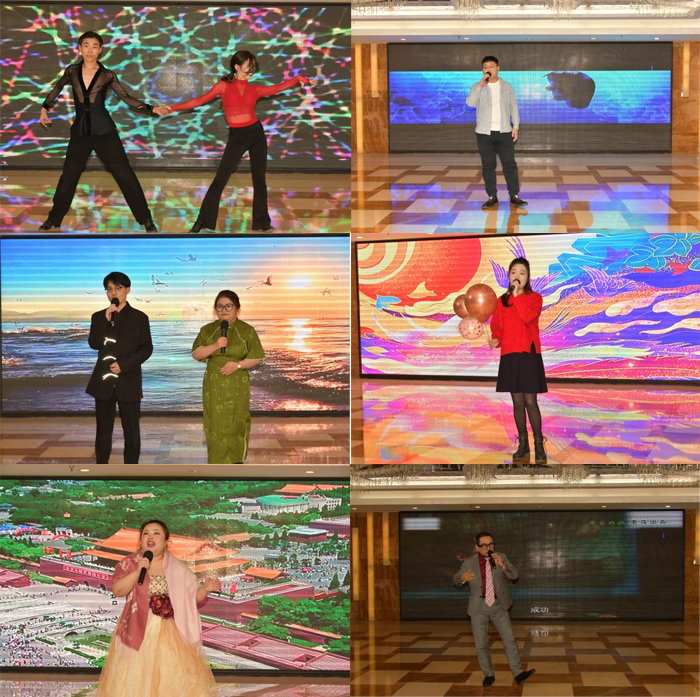 智能新信息学院陆梦圆的吉他弹唱《别怕变老》深情演唱♒️,基础部张博丞、张金华、谢京辉,何俊杰带来的相声《龙年大吉》让在场观众捧腹大笑。音乐教育学院沈春雷院长的一首男声独唱《父亲的草原母亲的河》中,充满了对家乡的眷恋和对父母的敬爱之情🤚🏼。音乐教育学院胡明哲女声独唱《我爱你中国》🧞,歌声激昂,深情表达了对祖国的热爱之情。