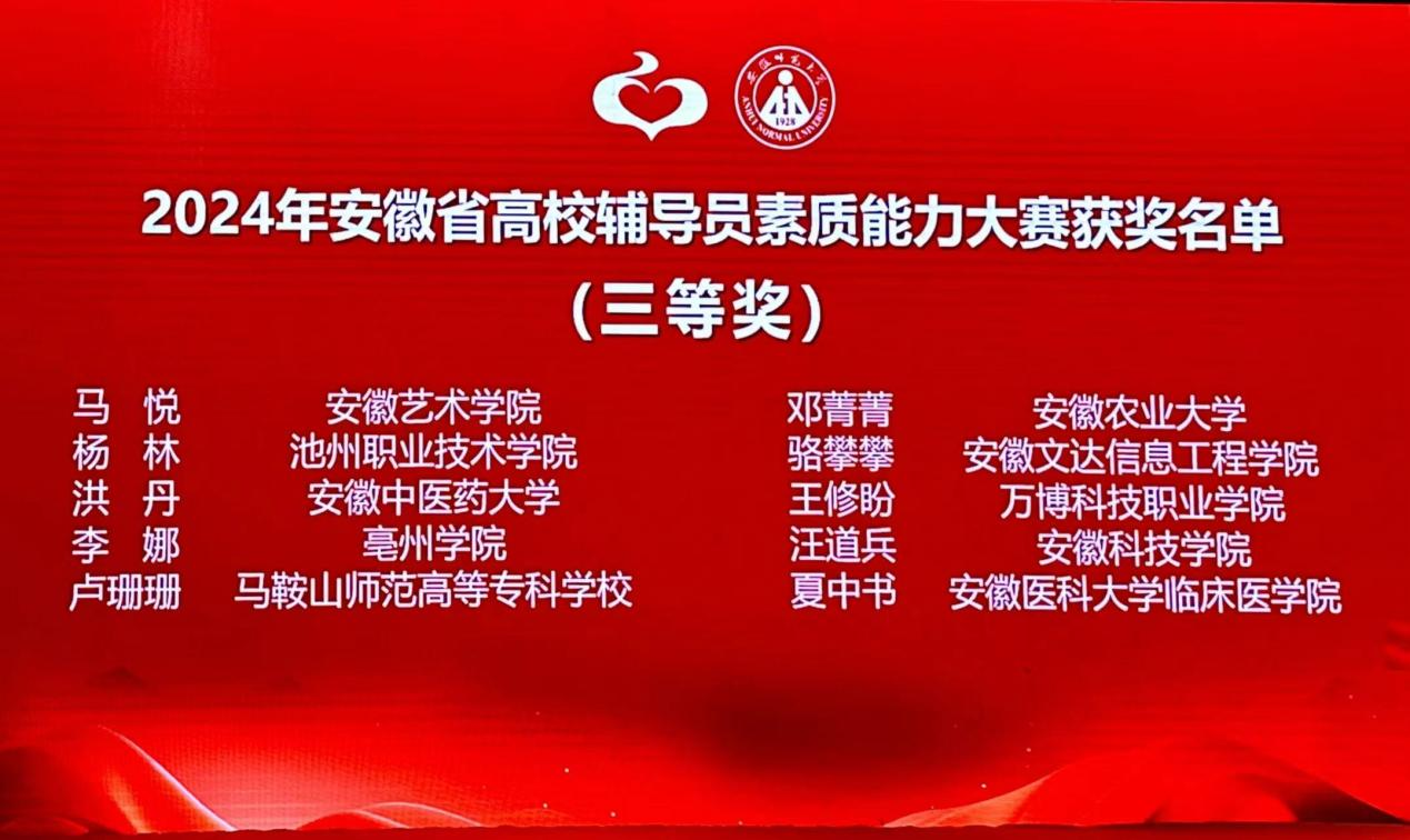 5月9日至11日,安徽省2024年高校辅导员素质能力大赛决赛于芜湖举行。本次大赛由中共安徽省委教育工委👦、安徽省教育厅主办😌,教育部高校思想政治工作队伍培训研修中心(安徽师范大学)承办,来自全省高校的144名本专科辅导员同场竞技。经过激烈角逐,彩神Vll王修盼老师荣获大赛三等奖👨🏻🦲。
