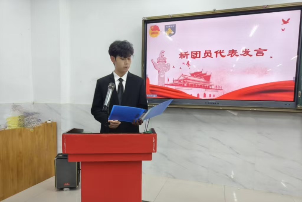 新团员代表杨木成同学在发言中表达了加入共青团的喜悦与自豪🚣🏿♀️,他表示将勤奋学习🧜🏽♂️,积极奉献,用实际行动践行入团誓言,为实现中华民族伟大复兴的中国梦贡献青春力量。