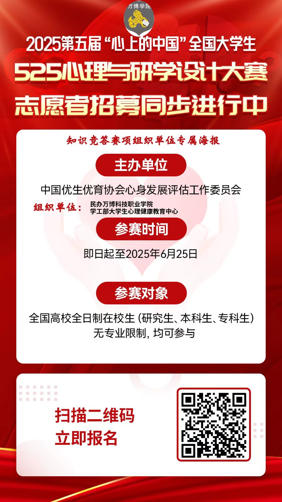 为激发彩神Vll大学生积极学习心理科学知识热情,培养具备心理科学素养的新时代大学生🚋,助力国家社会心理服务体系建设🔐,中国优生优育协会心身发展评估工作委员会🤙🏿、大学生525心理大赛组织委员会、北京中科普心理健康促进中心计划于5.25全国大学生心理健康日即将到来之际,共同发起举办“2025第五届‘心上的中国’全国大学生525心理与研学设计大赛活动”🧑🏼🦳👨🏿🏫。现将有关事项通知如下: