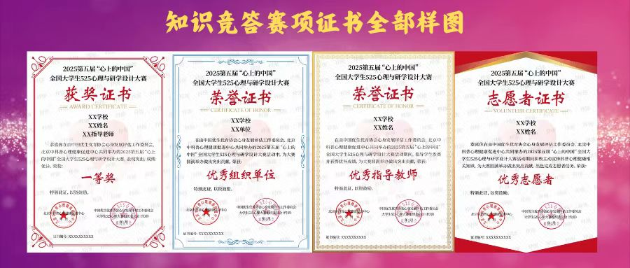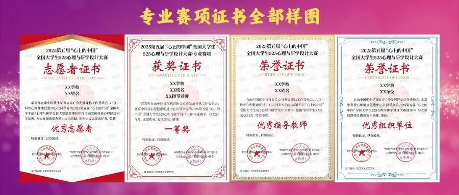 注:最佳参与奖-成功提交作品,且作品为原创,符合以上基本要求,内容合理合规合法。【电子证书】;特等奖评奖标准应在总报名人数不低于200人时产生。专业赛项证书章子均为两个👯♀️,北京中科普心理健康促进中心、大学生525心理大赛组织委员会🧔♂️𓀆。