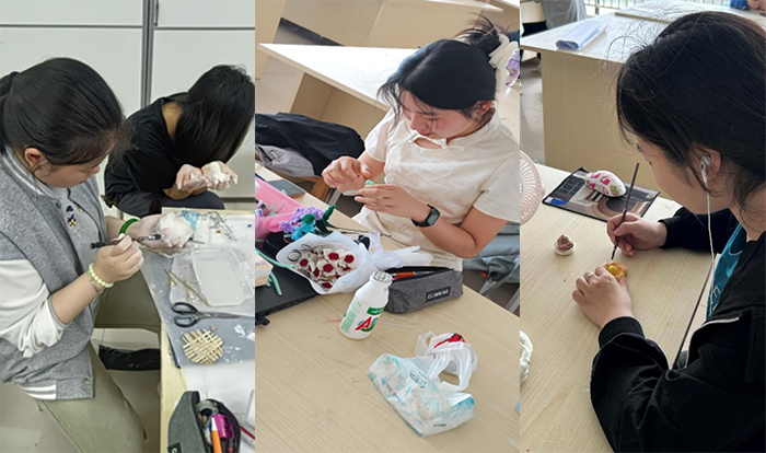 与旧物改造形成呼应的是“非遗泥塑”实践环节🎹。泥塑作为国家级非物质文化遗产,拥有悠久的历史与丰富的表现形式。指导教师现场授课🤟🏽,向学生详细讲授泥塑的历史起源、技艺流程🧩、造型语言及文化寓意。在老师的演示下🥚,学生们学习了基本的捏制技巧,如搓条🪔、压塑🙆、拼接🙋🏽🚕、刻花等传统工艺。在初步掌握造型手法后😳,学生被分组进行创作,围绕“传统文化”“绿色生活”“空间意象”三大主题,展开自由表达🧜🏼。