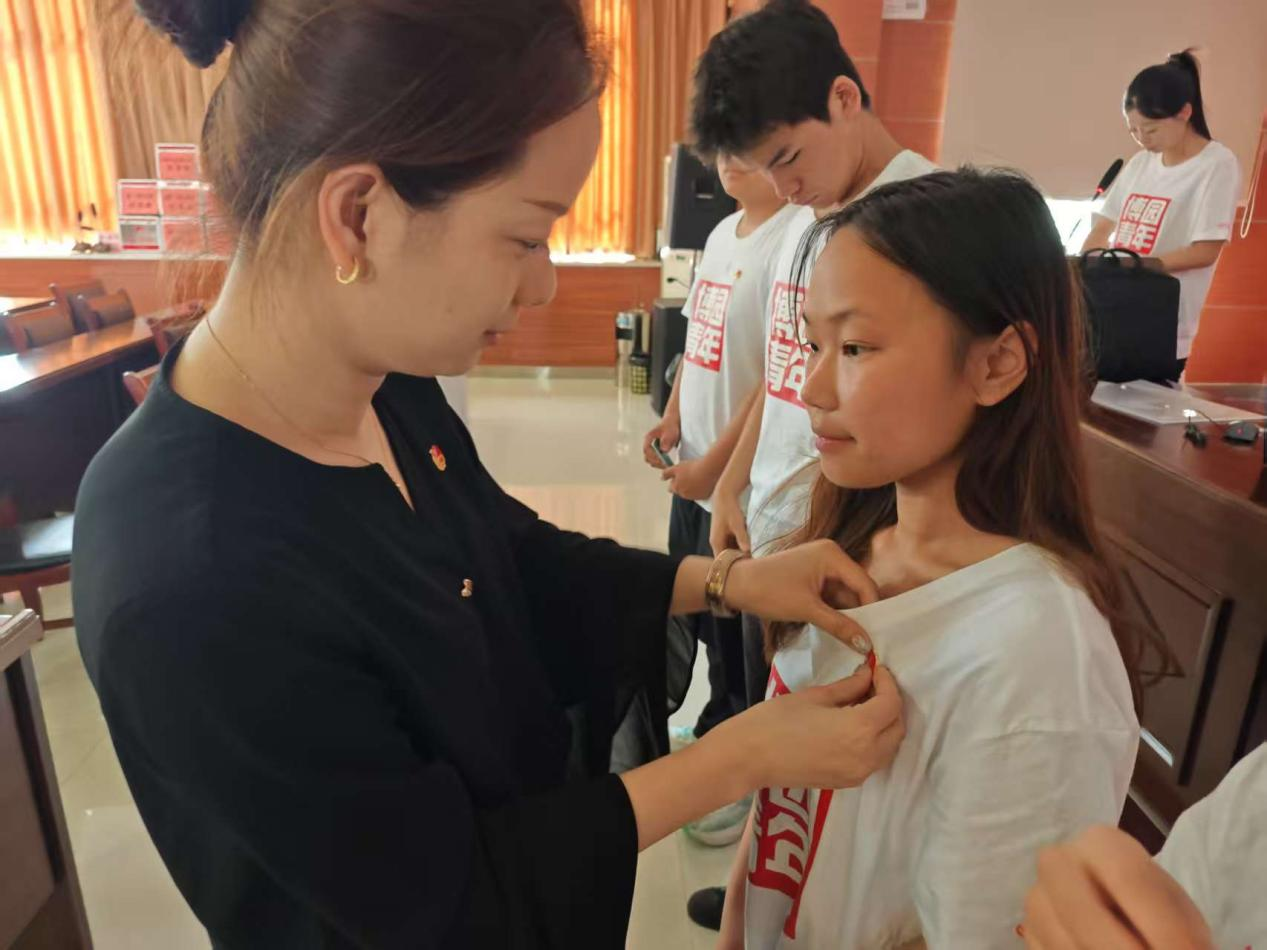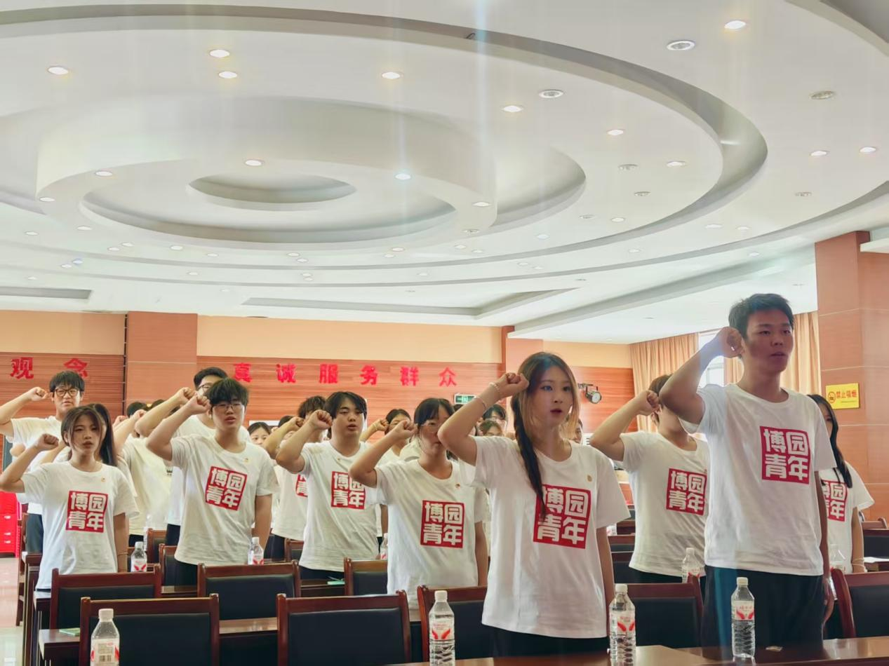 随后,团委书记王媛媛宣读了新团员名单。各二级学院团总支书记为新团员逐一颁发团员证并佩戴团徽。在优秀团员代表的带领下,全体新团员面向鲜红的团旗,庄严宣誓。新、老团员代表依次发言,表达了践行誓言、贡献青春力量的坚定决心。
