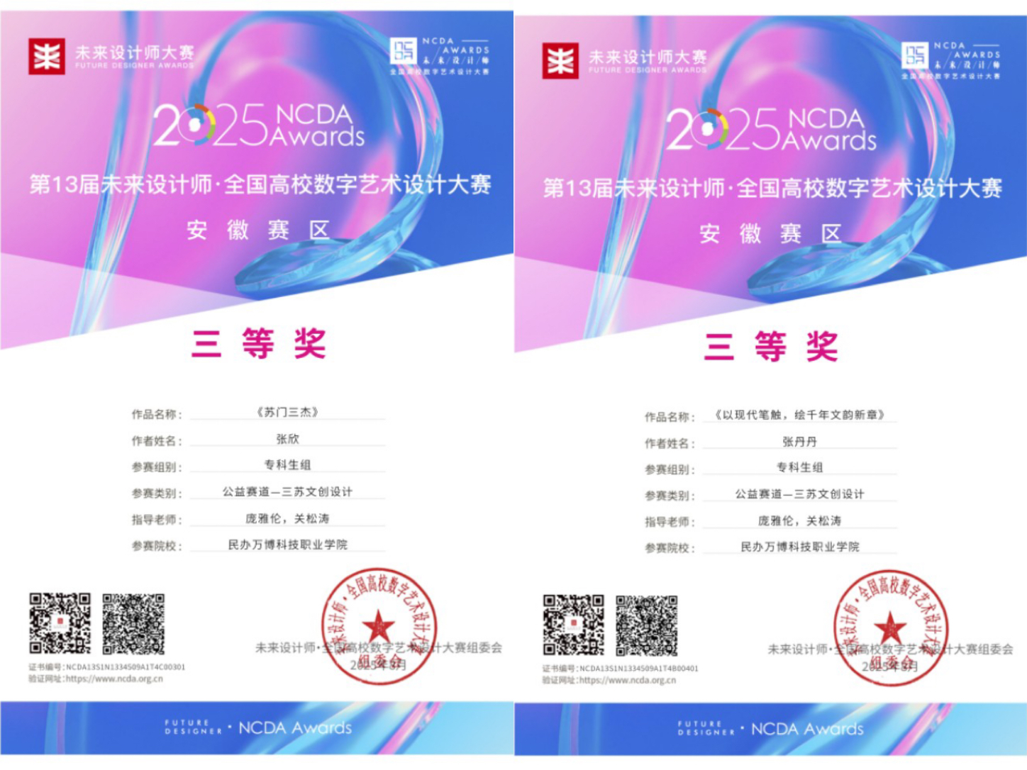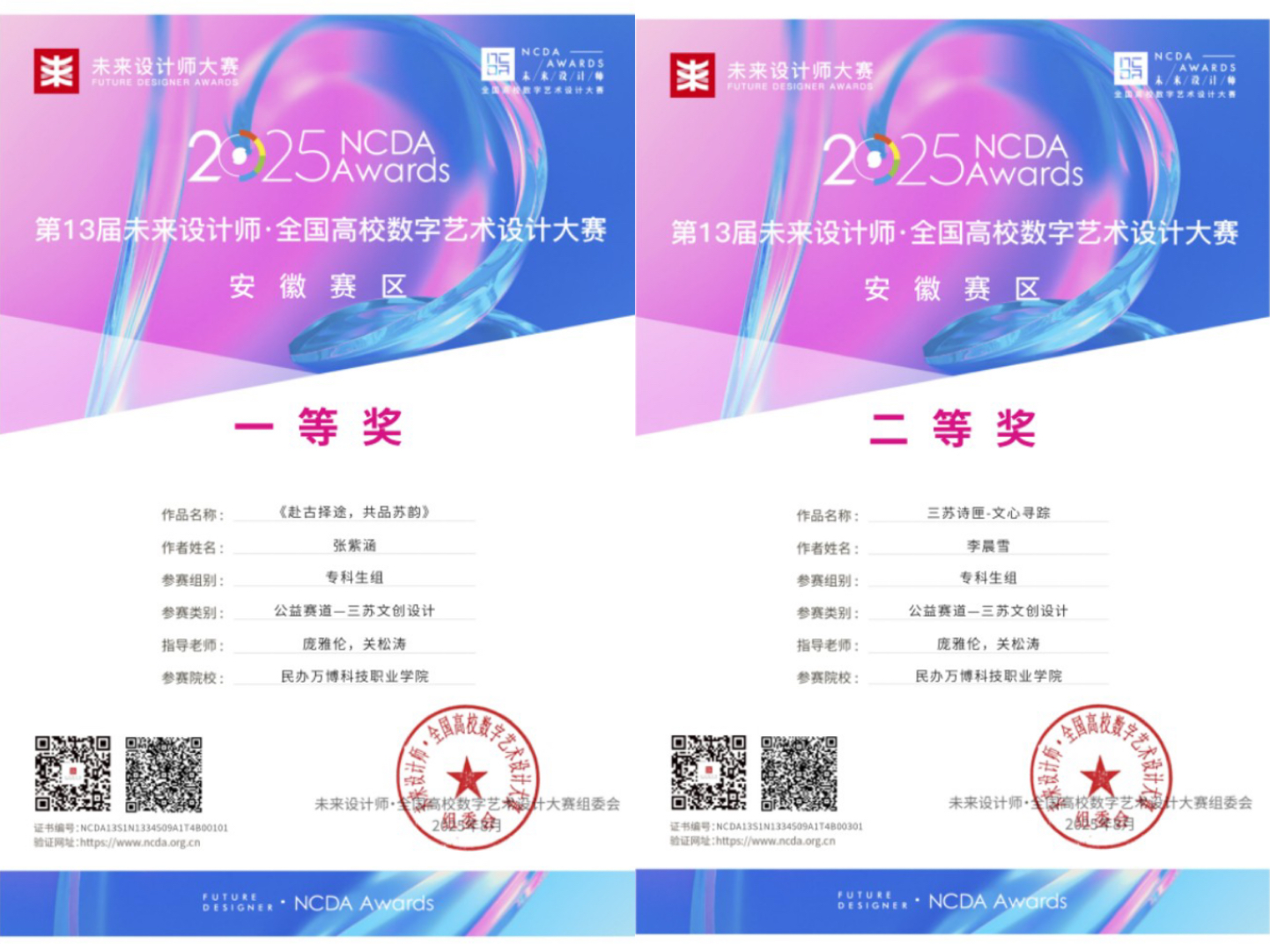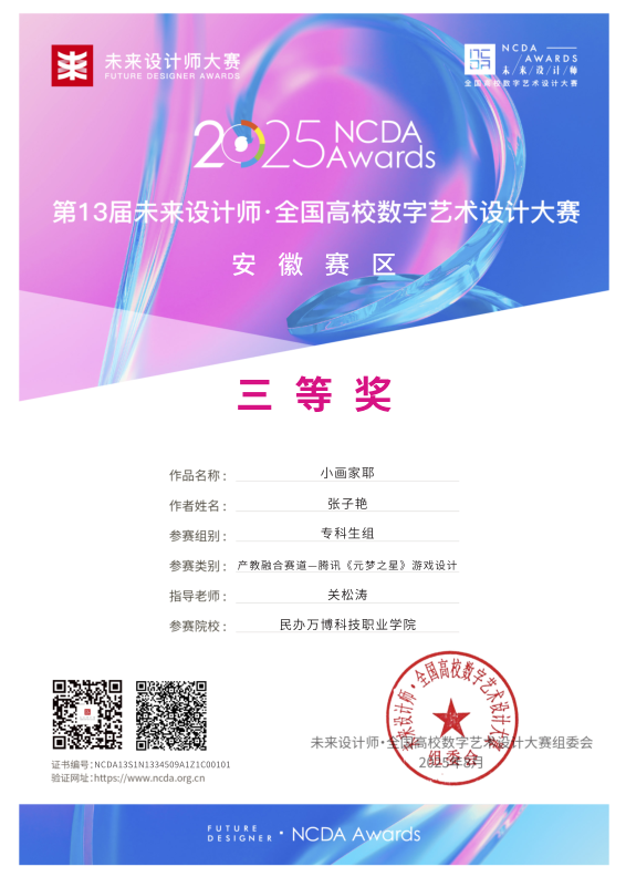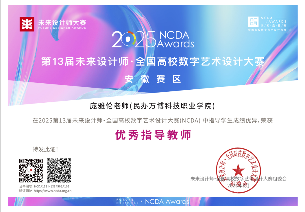 此外🤸🏼♂️📷,日前🫄,在2025年第十三届未来设计师·全国高校数字艺术设计大赛(NCDA)中,彩神Vll师生同样表现突出📐,荣获全国总决赛三等奖1项;在安徽赛区比赛中,获一等奖1项、二等奖1项、三等奖3项;2位教师获评“优秀指导教师”📧,1位教师获评“优秀组织教师”,学校获省级“优秀组织单位”称号🤶🏻。