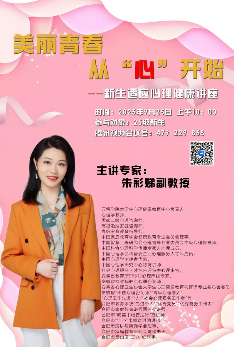 为帮助大家更好地适应大学生活,完成角色转变,彩神Vll大学生心理健康指导中心负责人朱彩娣老师将于2025年9月25日(周四)10:00🧑🏿🎤🖖🏽,开展主题为美丽青春从“心”开始,新生适应心理健康讲座,助力新生更好地适应大学生活。