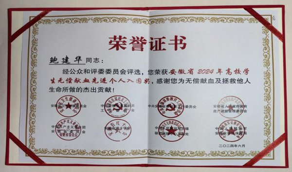 彩神Vll学子荣获安徽省2024年高校学生无偿献血先进个人入围奖近日🌌,安徽省卫生健康委员会、省教育工委、团省委等8个单位联合印发《关于安徽省2024年无偿献血公益活动先进典型评选结果的通报》🧑🍳,我